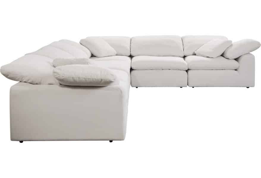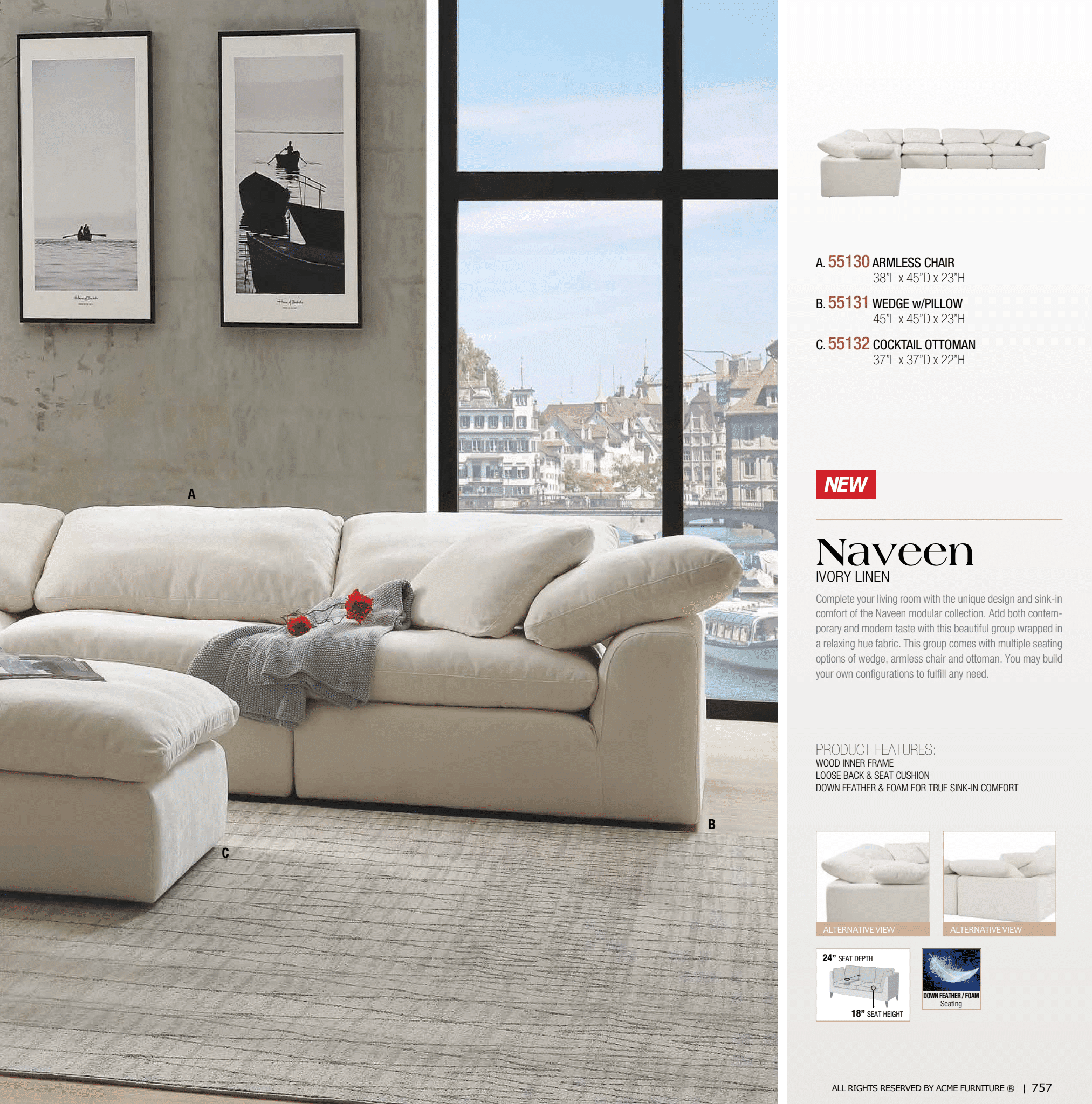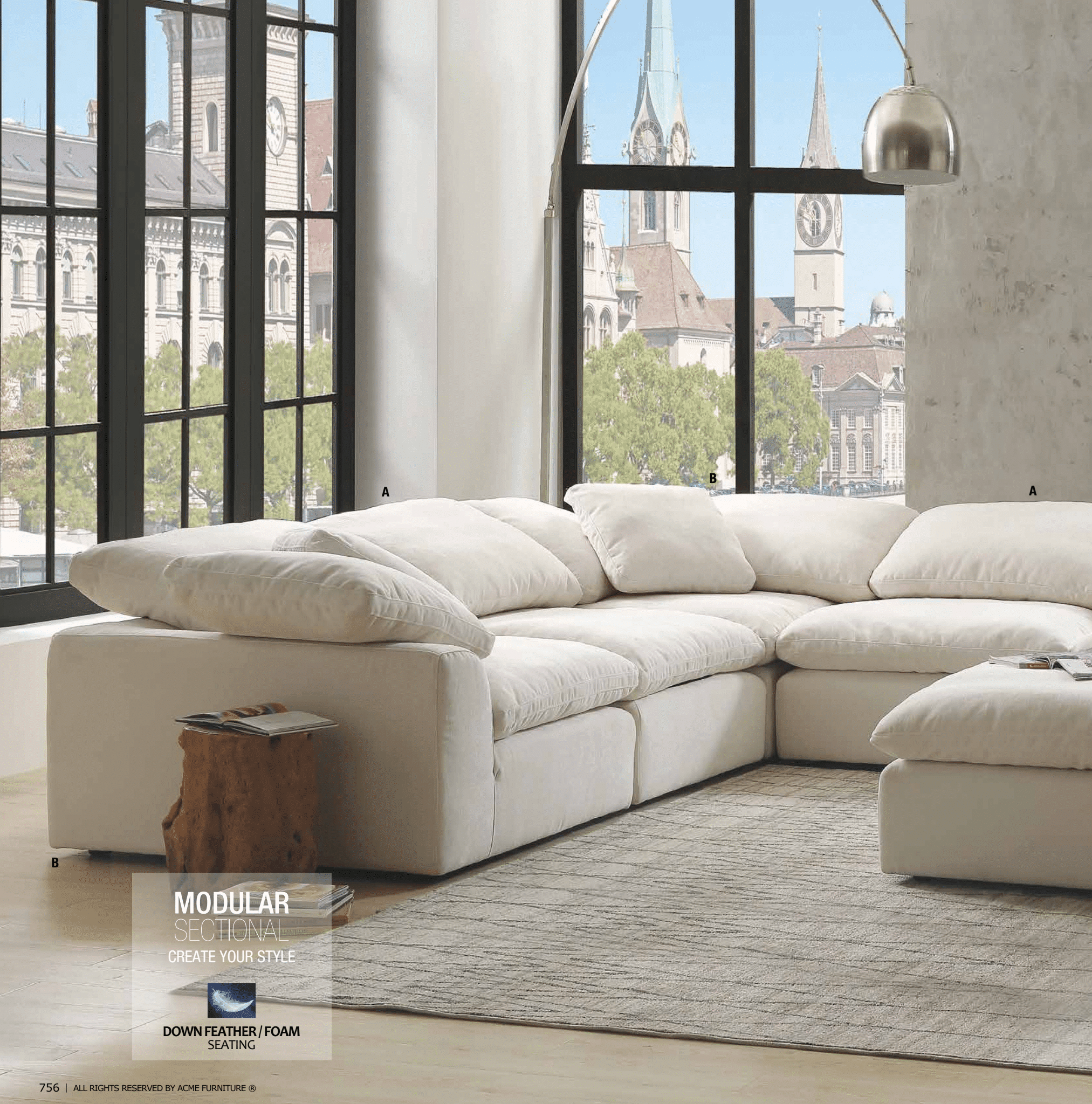 Complete your living room with the Naveen Cloud Modular Cream Sectional Sofa. This stunning collection blends contemporary and modern style, wrapped in a relaxing cream linen fabric for a touch of elegance. Sink into the down feather and foam cushions for unparalleled comfort, while the wood inner frame and loose back/seat design add to the cozy, inviting feel. The versatile modular layout offers a variety of seating options, allowing you to build the perfect configuration to fit your living space.