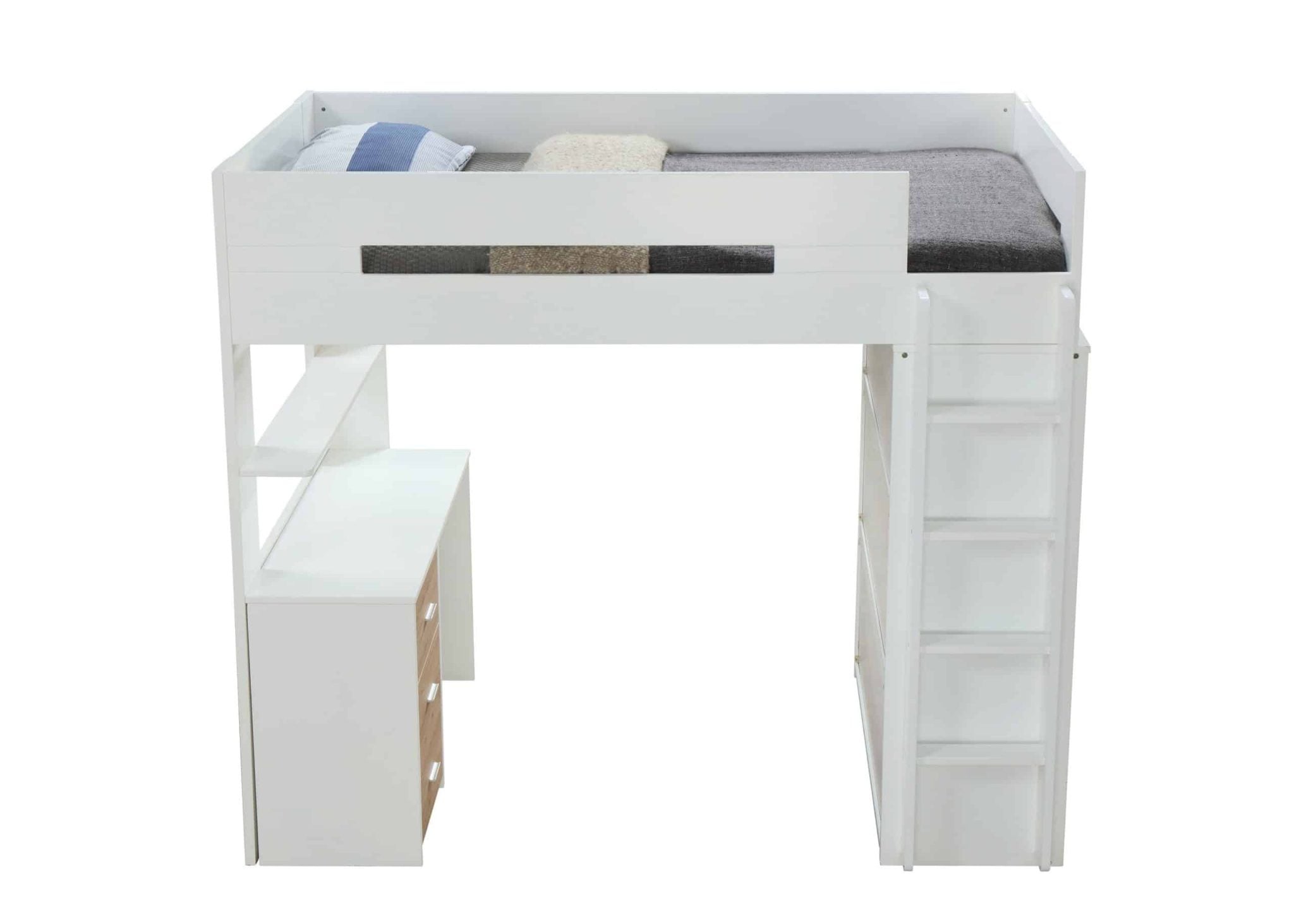 The Nerice white wood bunk bed features a loft bunk bed for children. This loft bed is for either boys or girls rooms. With a desk underneath, it offers ideal space to play.