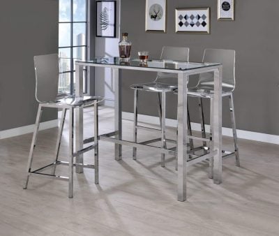 The Nessle Dining Set features a contemporary rectangular bar set finished in chrome