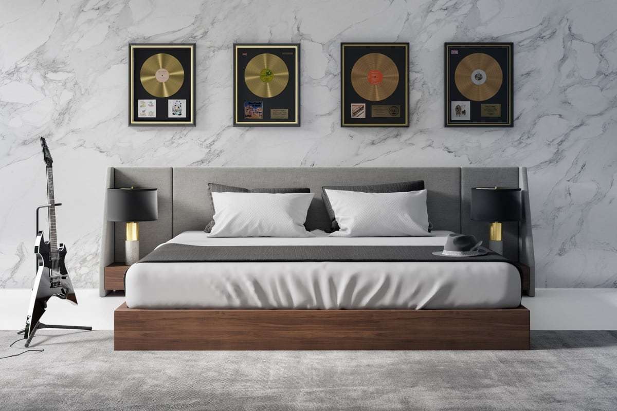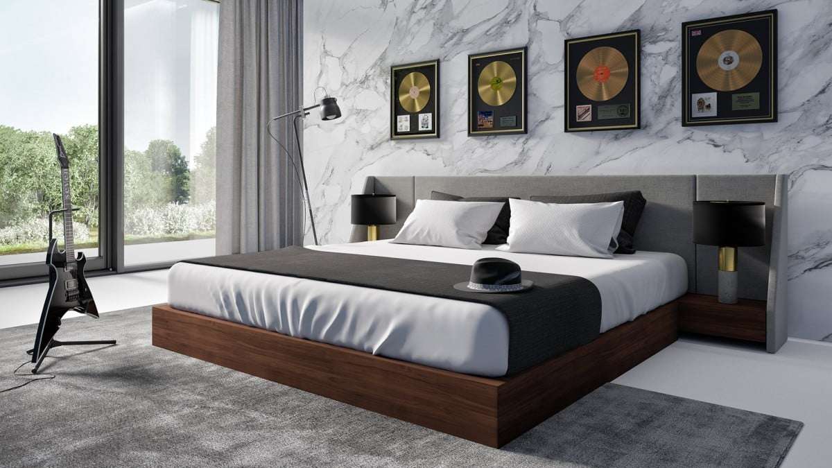Nova Domus Janice – Modern Grey Fabric & Walnut Bed With Nightstands