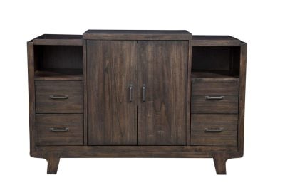 This fabulous wood server complements your existing dining accouterments in grand style, complete with pine solids highlighted by a rich chocolate brown finish. Distinctive contemporary hardware accents this piece’s two cabinet doors and four drawers. Even a hidden drawer and two storage shelves on the cabinet interior make a cameo.