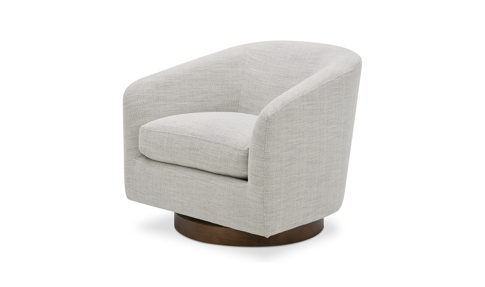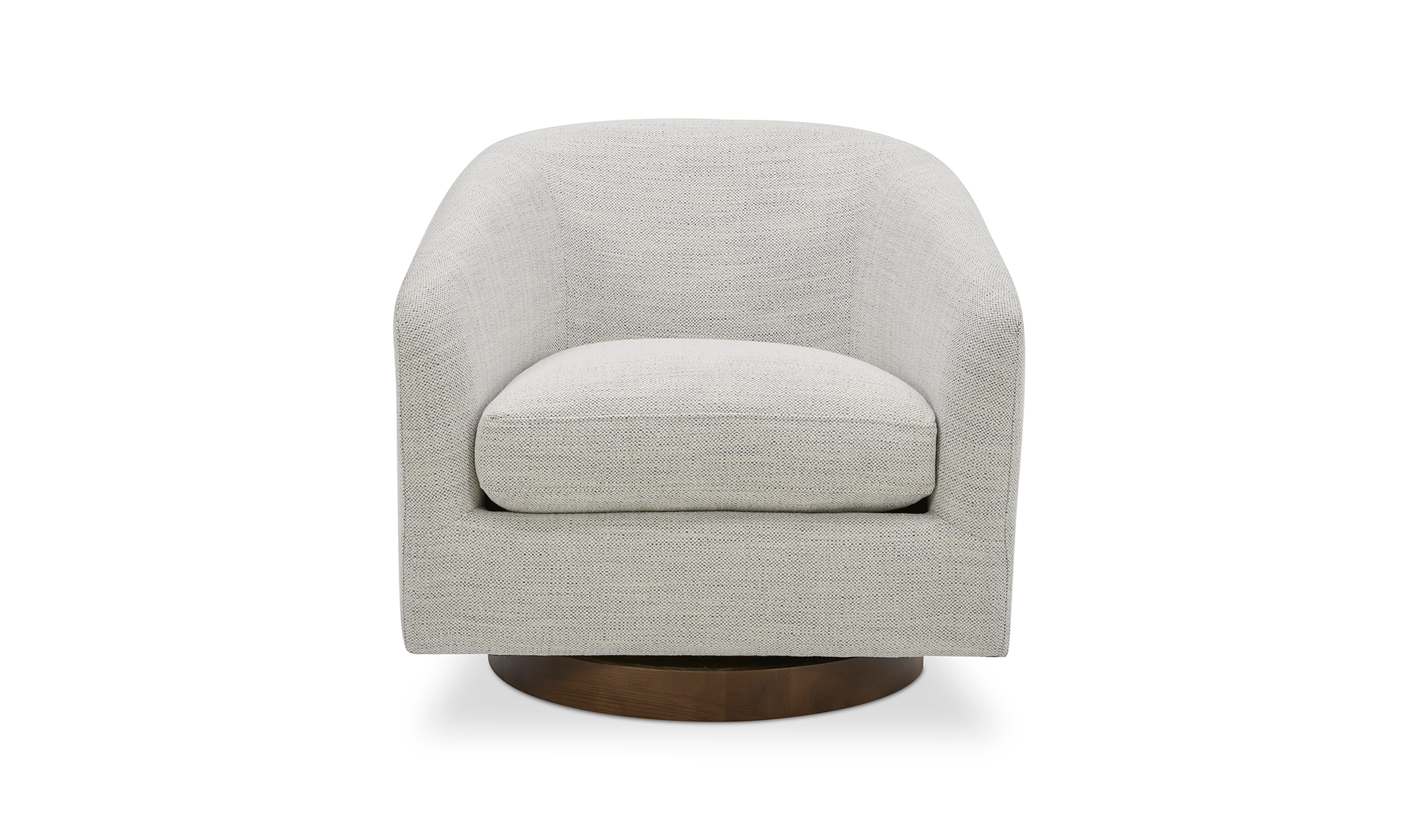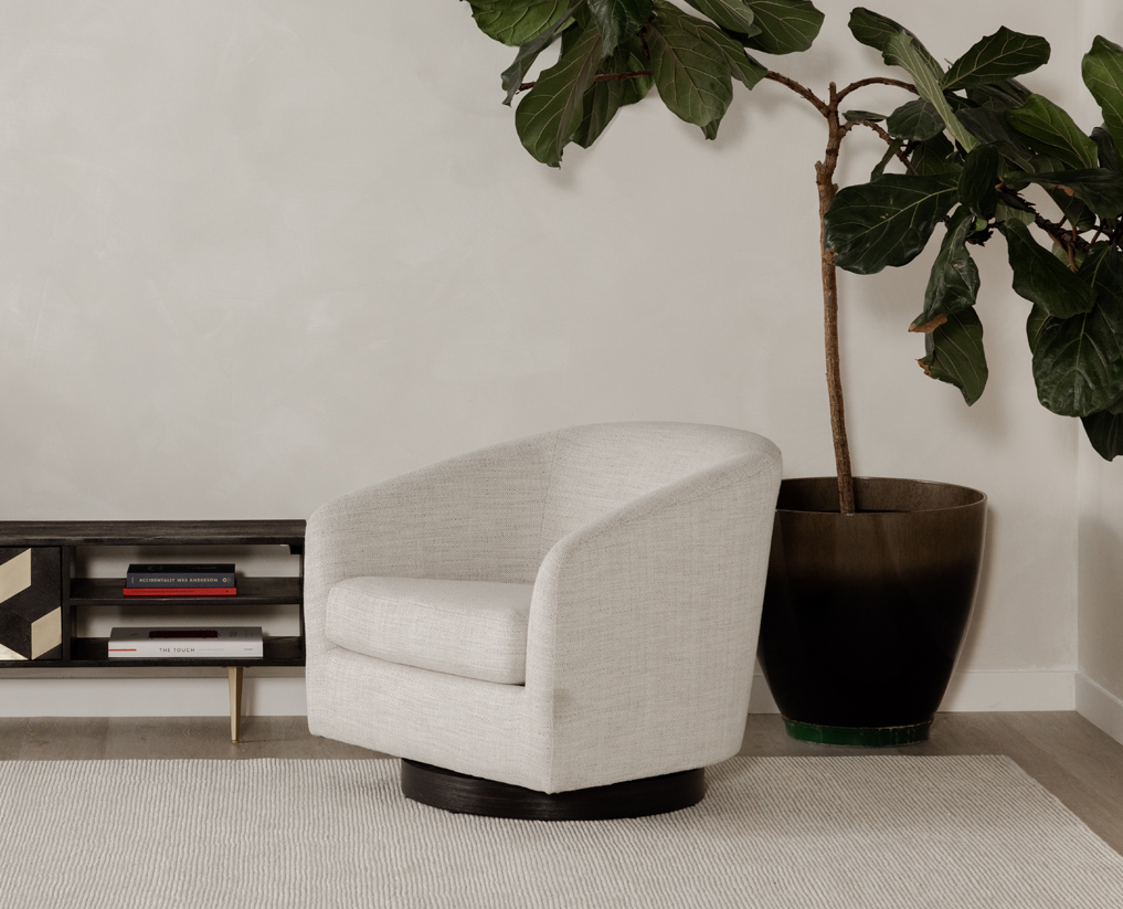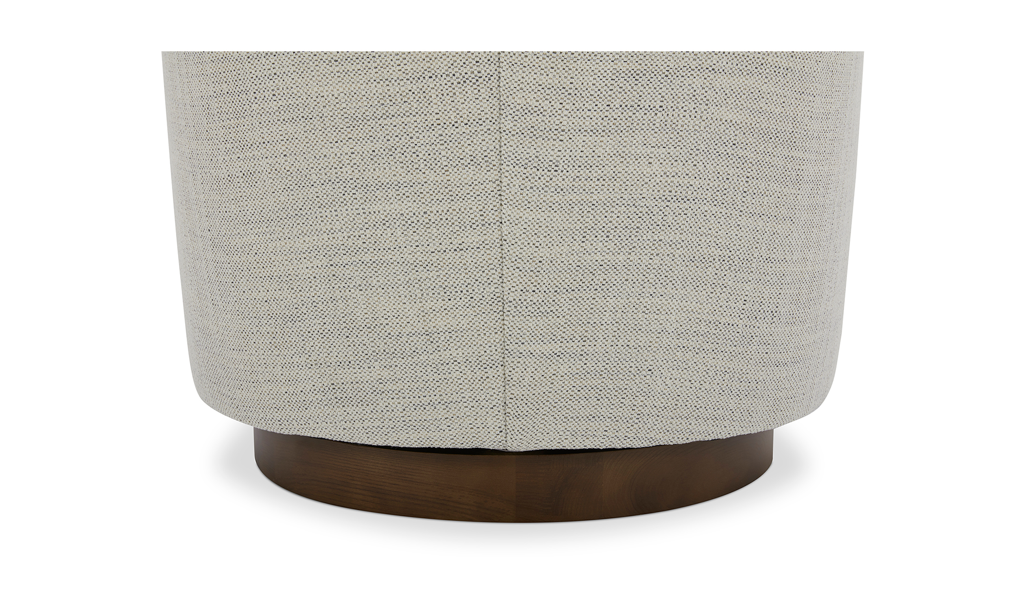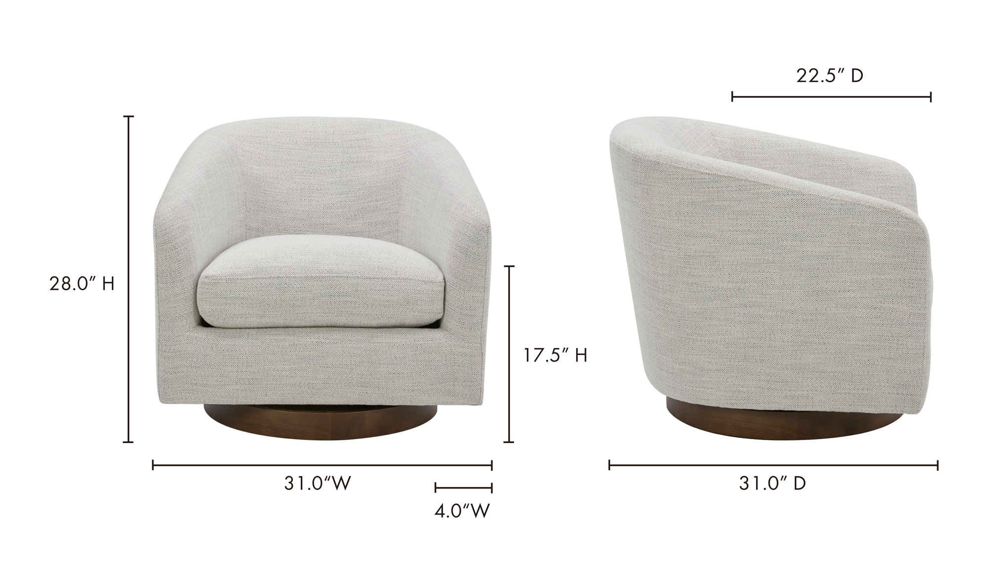 The Oscy Swivel Floating Base Lounge Chair blends modern design with cozy comfort. Featuring a 360° swivel base, this off-white swivel chair allows for effortless movement, making it a perfect addition to any living space. Its soft polyester upholstery and high-density foam cushioning provide an inviting seat, while the solid dark brown wooden base adds a floating aesthetic. Ideal for reading nooks, lounge areas, or as an accent piece, this chair brings airy energy and chic style to any interior.