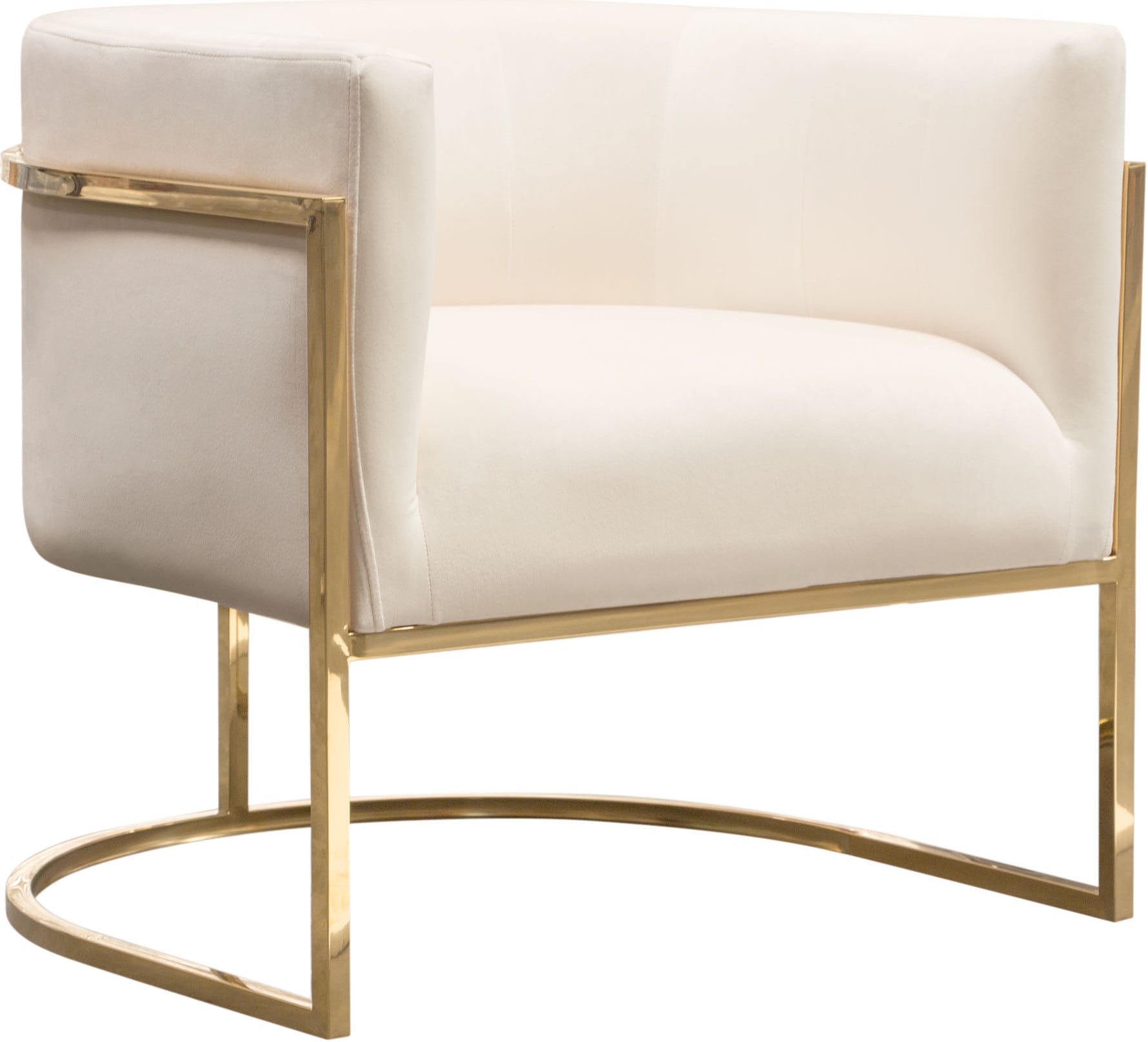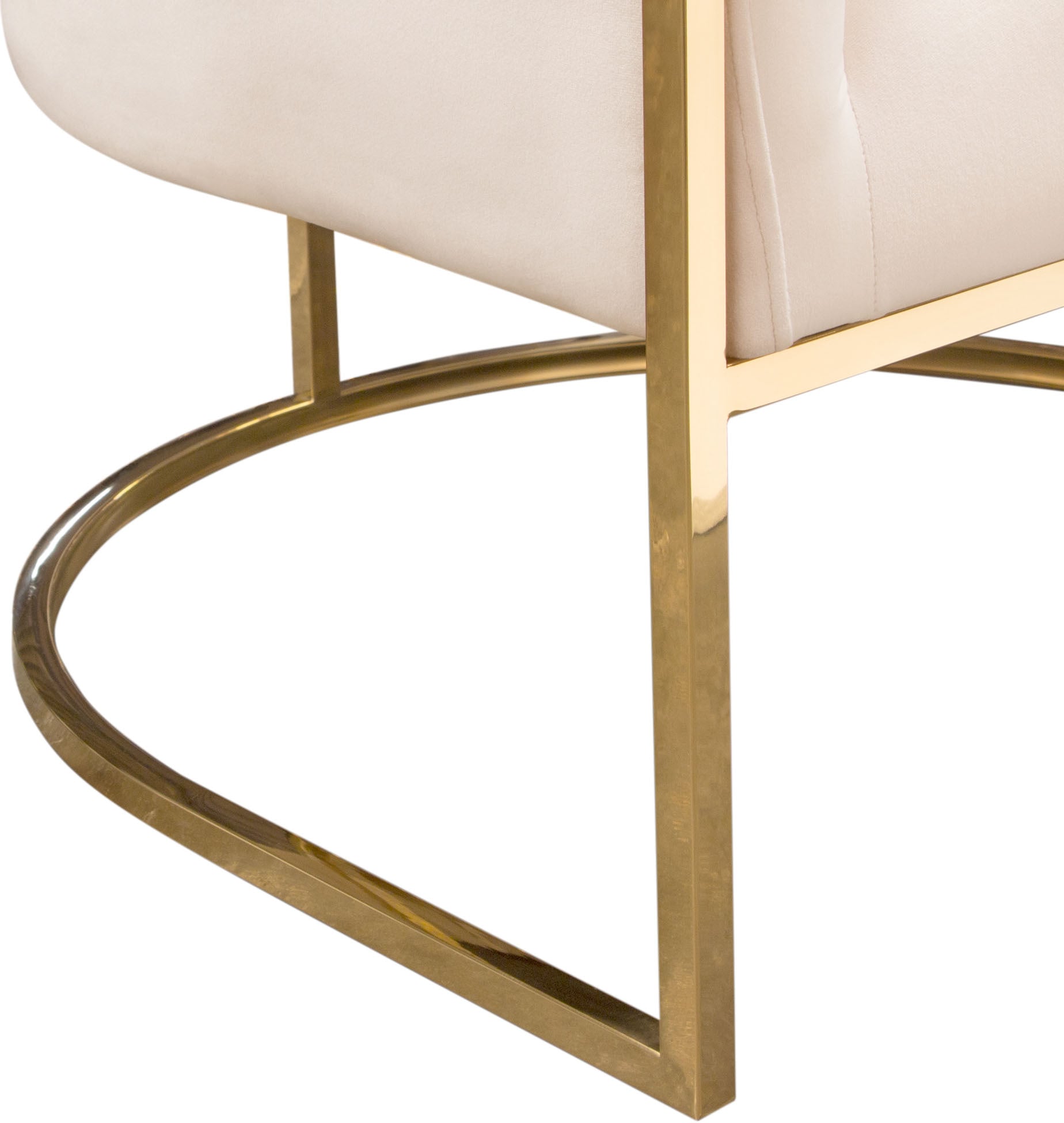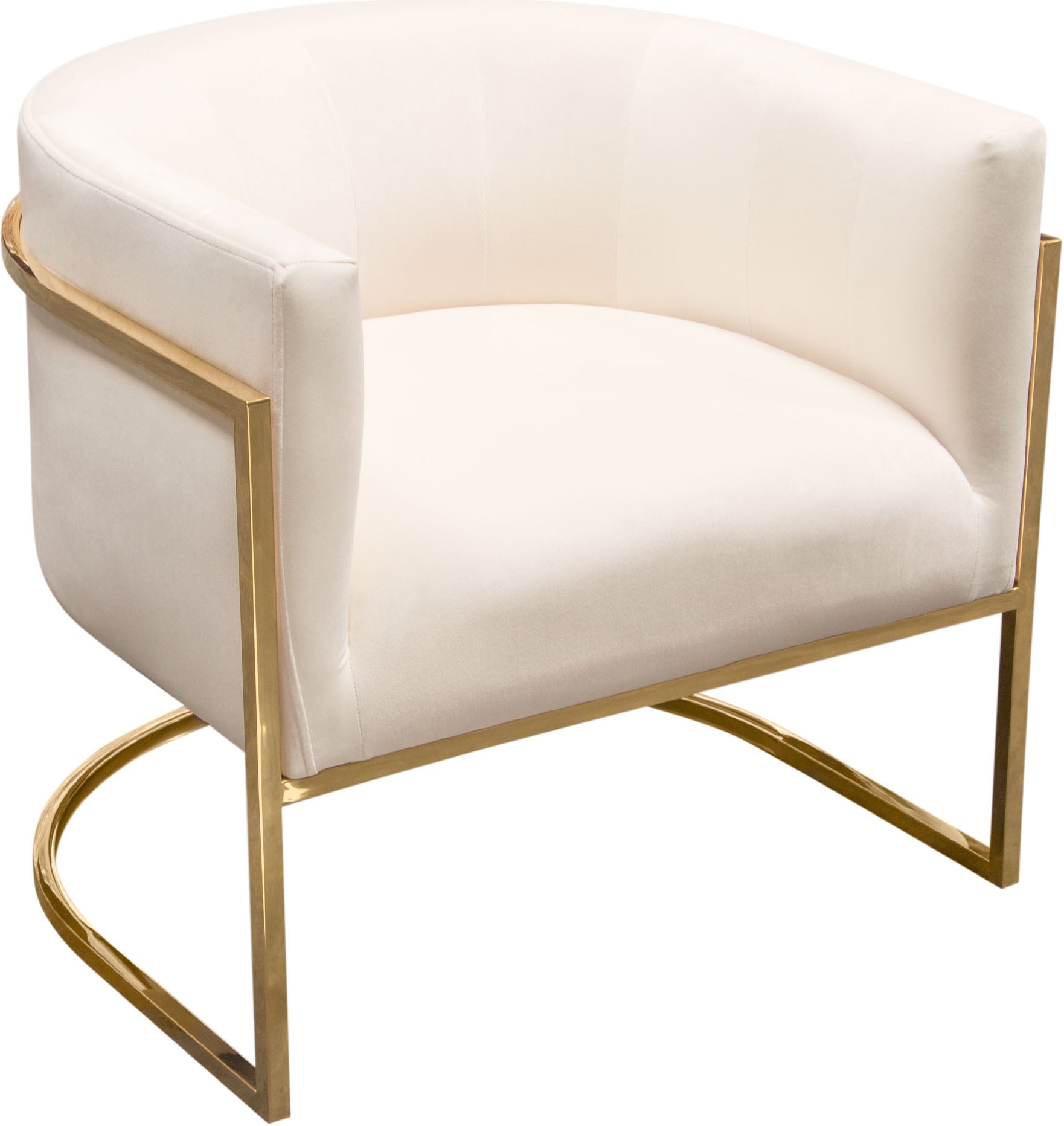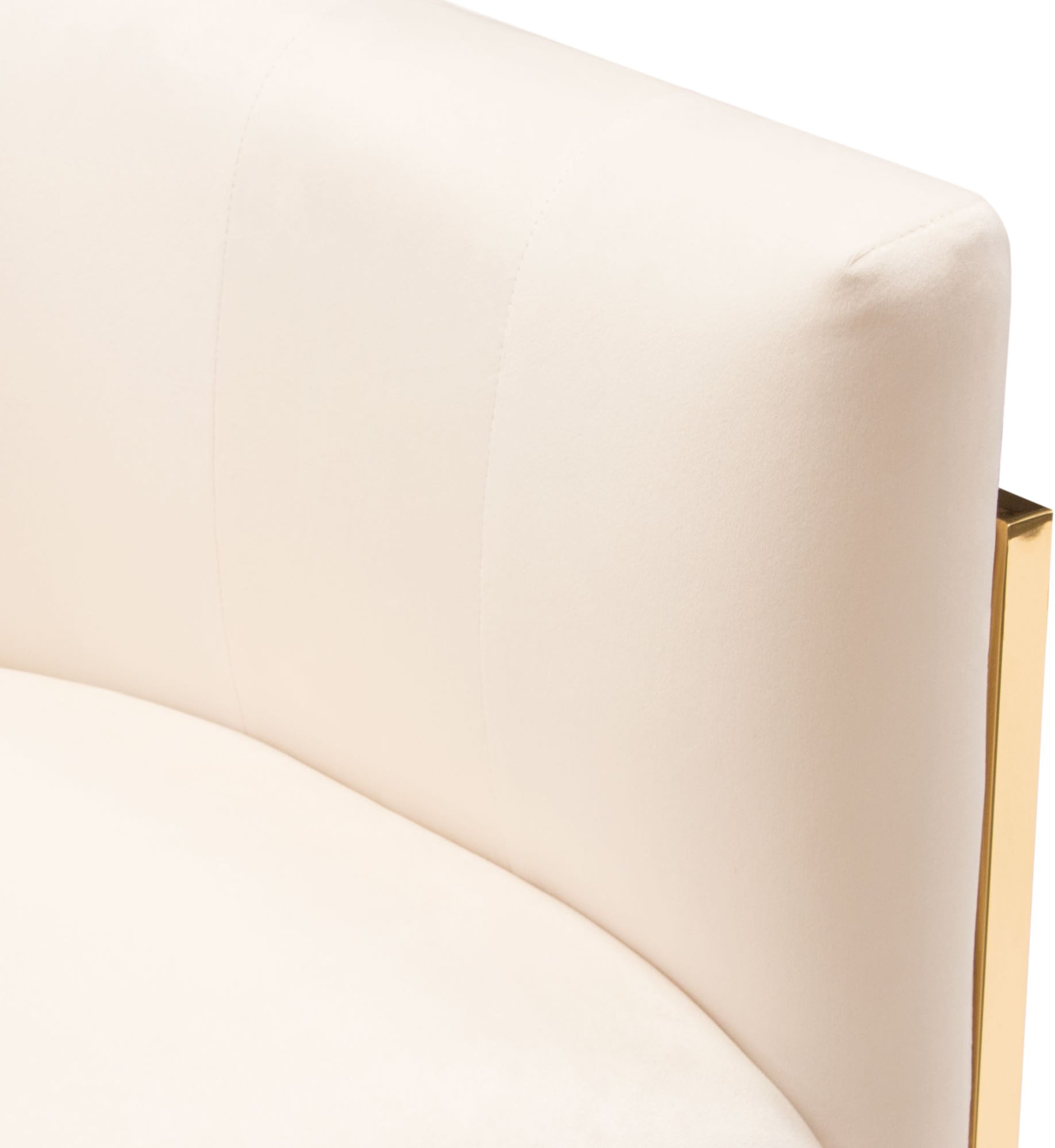 The Pandora Cream Velvet & Gold Accent Chair blends elegance with modern design. Wrapped in cream velvet and supported by a polished gold stainless steel frame, this chair features a barrel-back silhouette with vertical channel tufting for a refined touch. The 20-inch seat height provides comfort, making it a stylish addition to any living room, bedroom, or lounge. With its soft upholstery and striking gold base, this chair enhances contemporary spaces with sophistication and charm. No assembly is required, allowing for an effortless upgrade to your home decor.