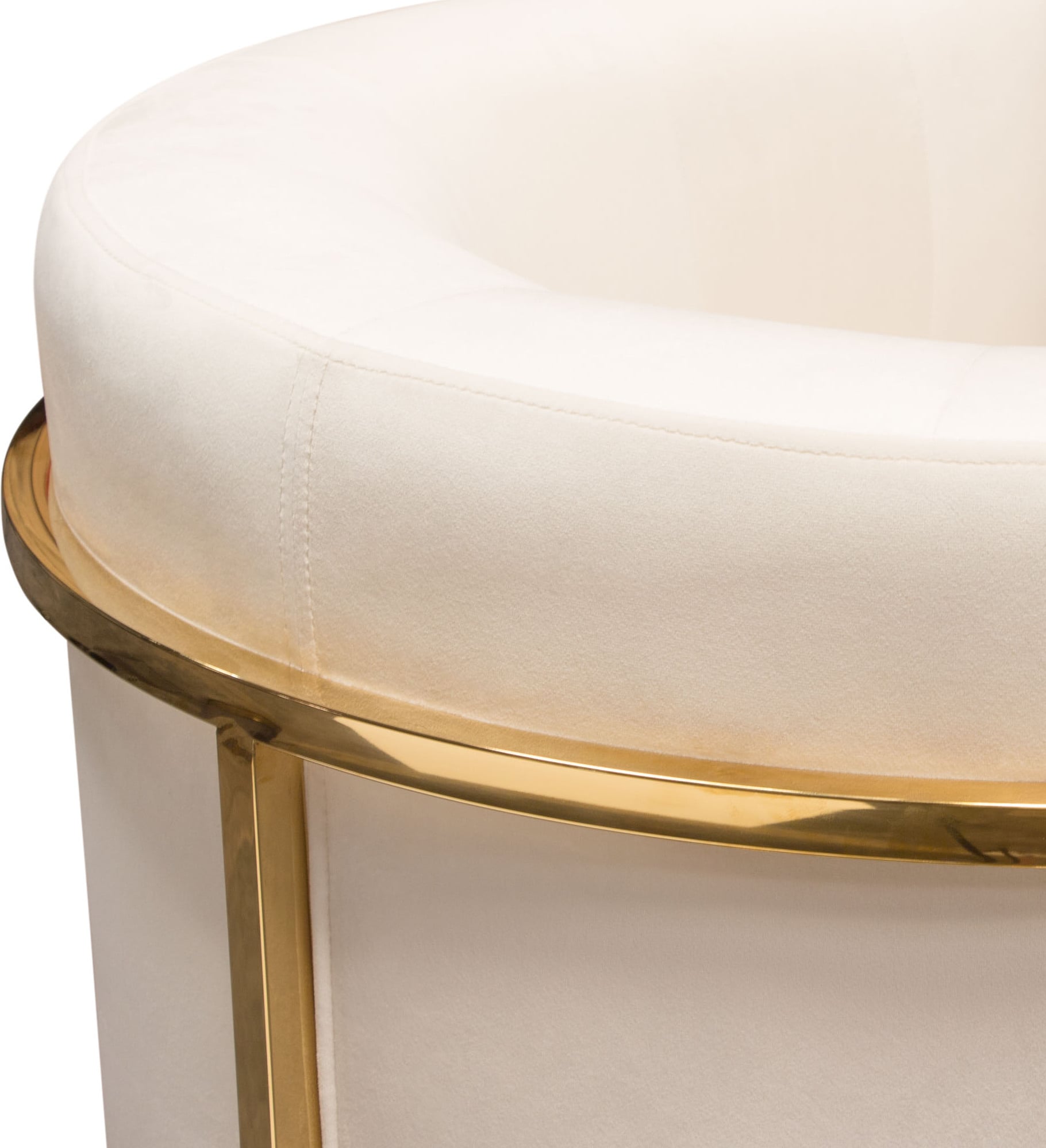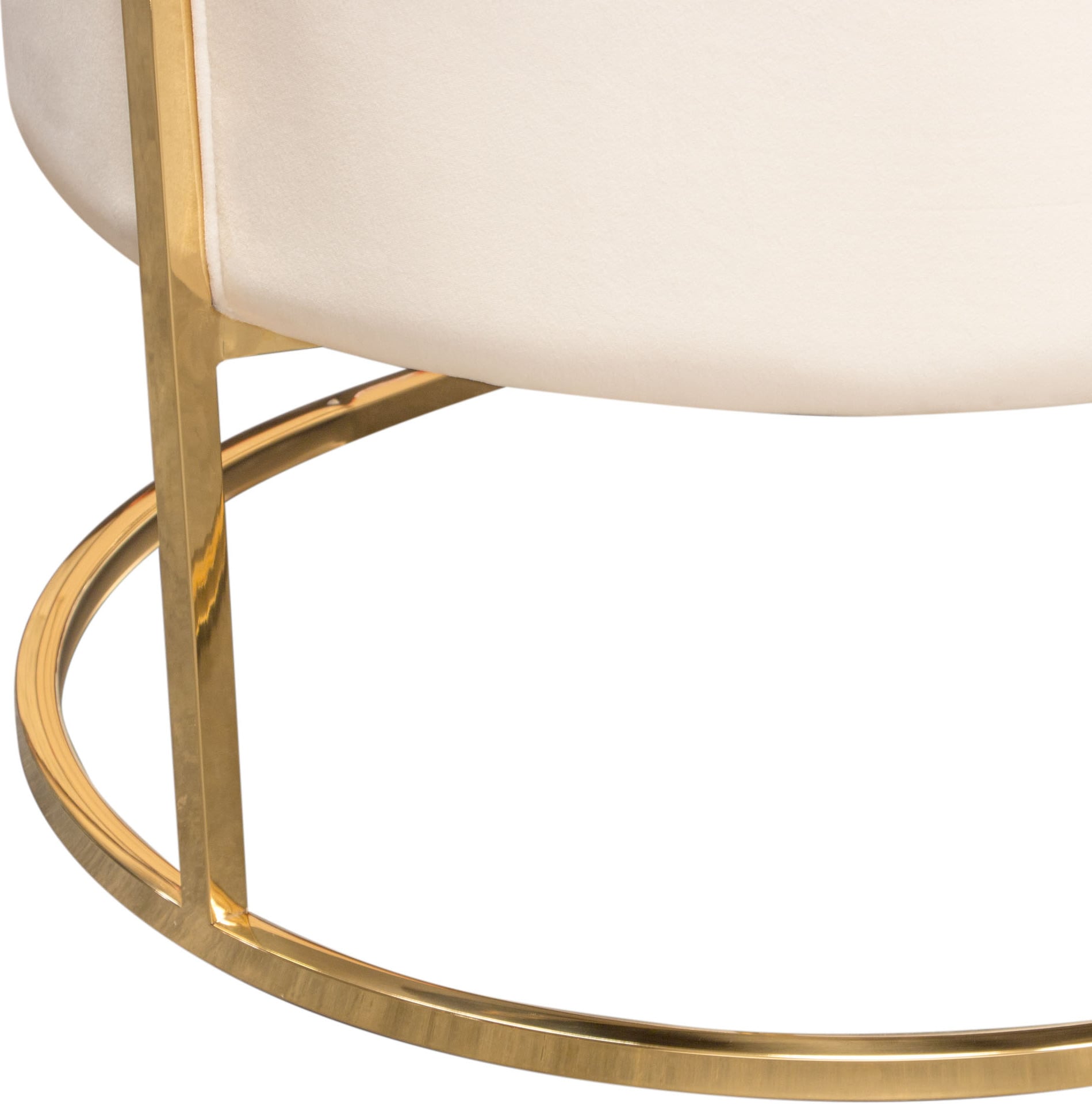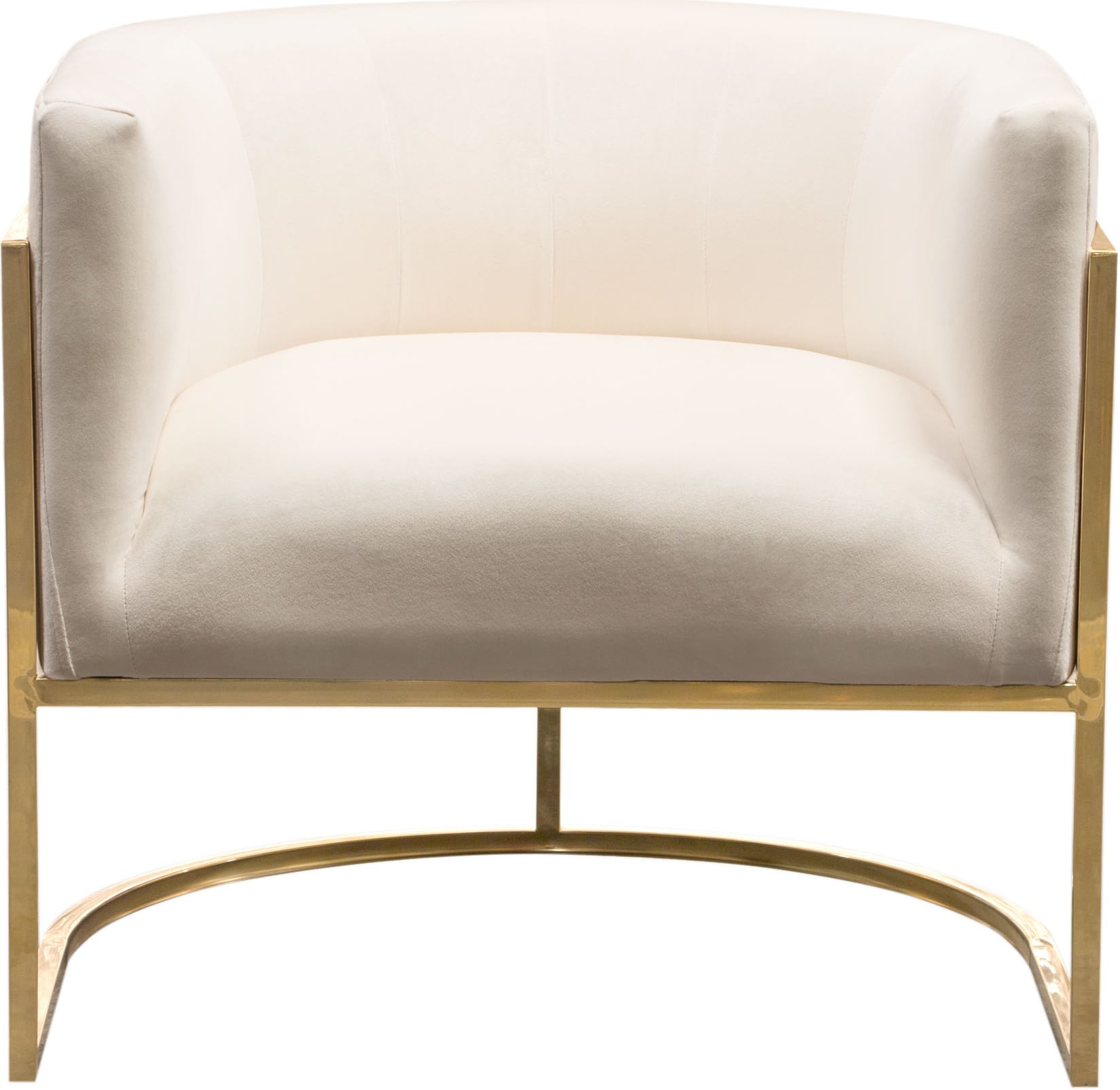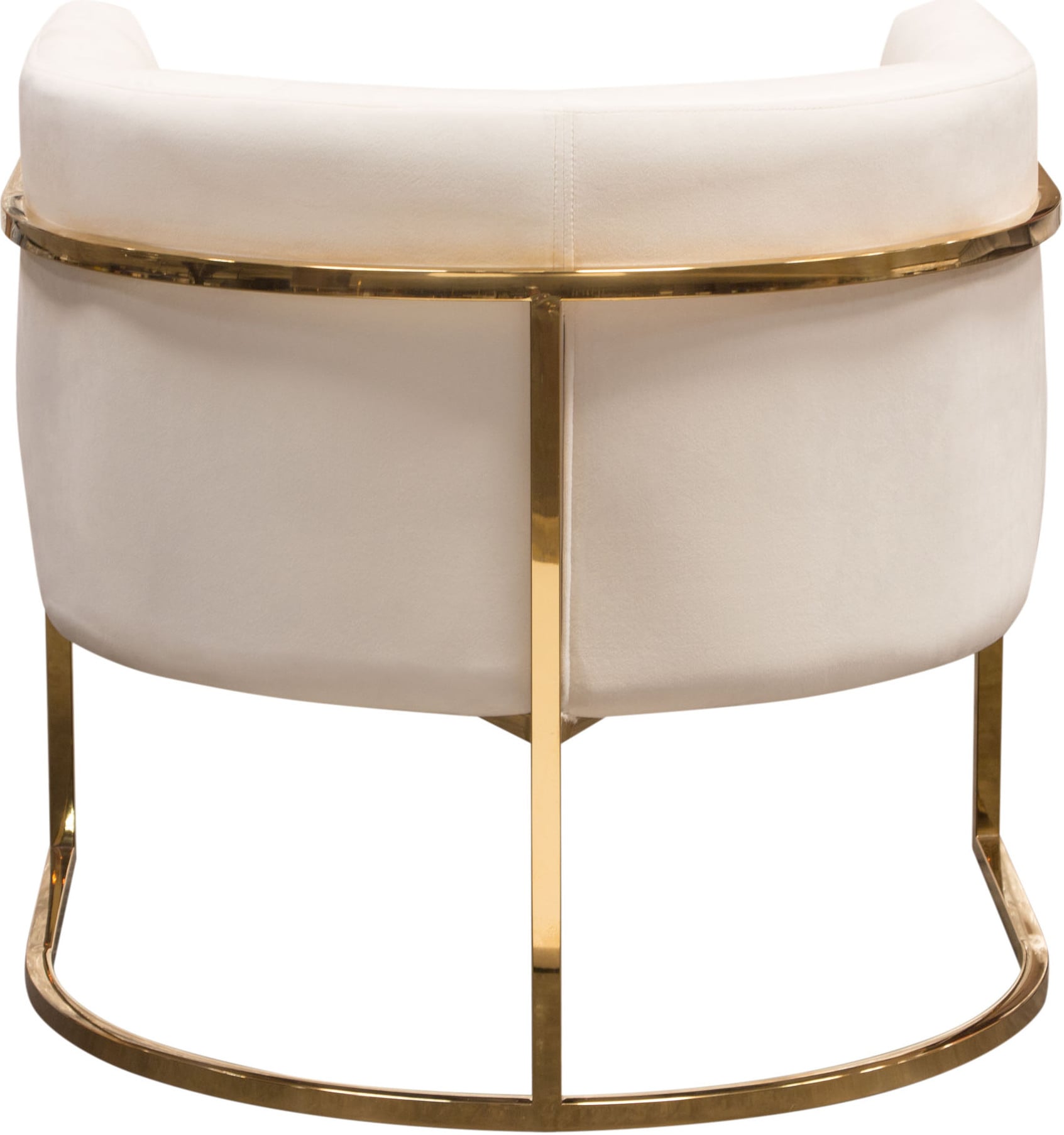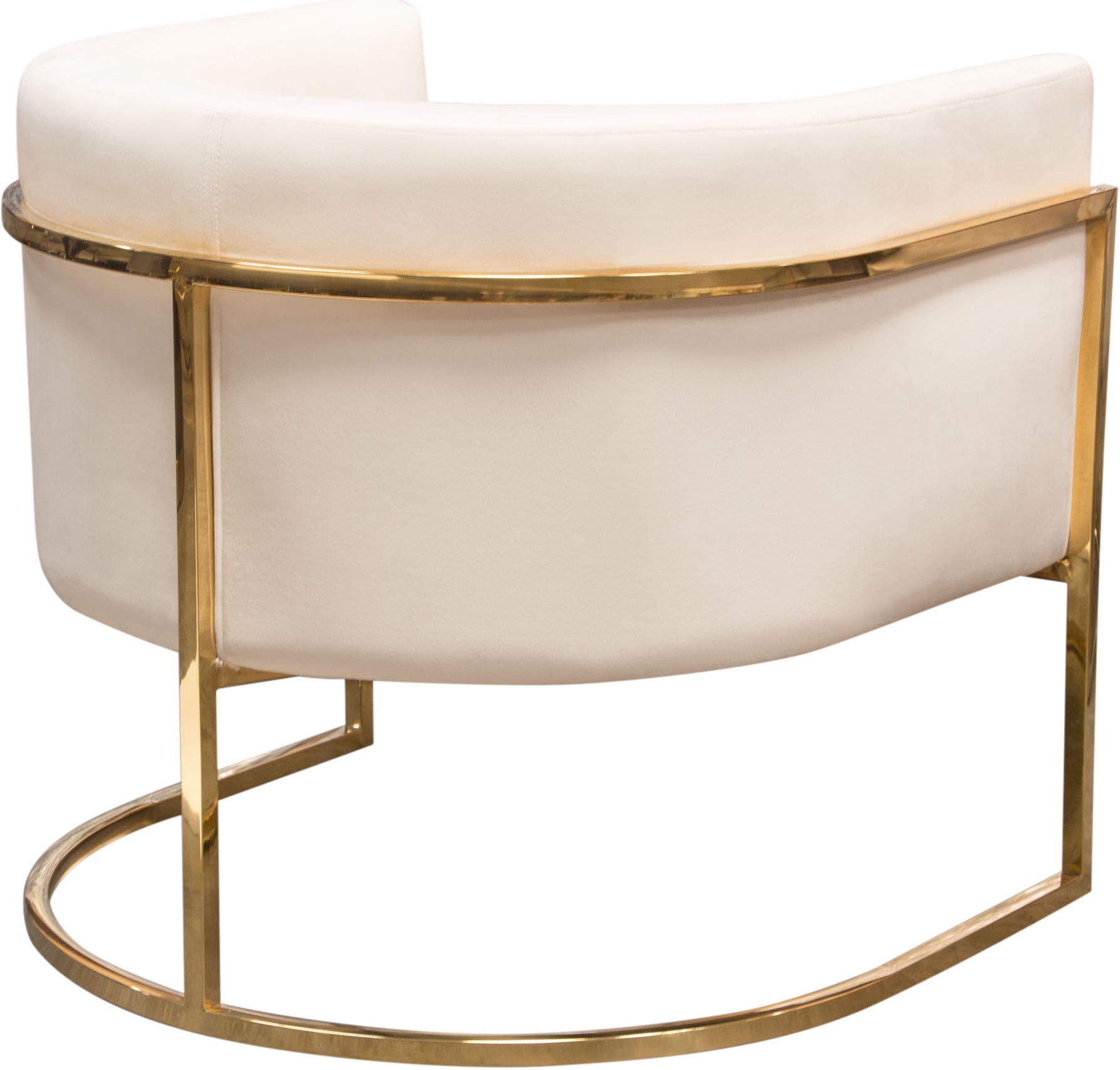 The Pandora Cream Velvet & Gold Accent Chair blends elegance with modern design. Wrapped in cream velvet and supported by a polished gold stainless steel frame, this chair features a barrel-back silhouette with vertical channel tufting for a refined touch. The 20-inch seat height provides comfort, making it a stylish addition to any living room, bedroom, or lounge. With its soft upholstery and striking gold base, this chair enhances contemporary spaces with sophistication and charm. No assembly is required, allowing for an effortless upgrade to your home decor.