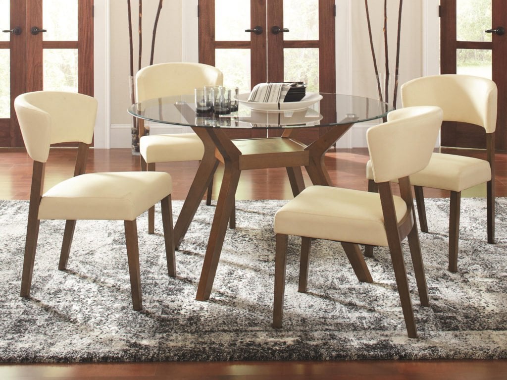 Enjoy delicious meals and engaging conversation seated around this contemporary dining table. From the delightful Paxton collection, the table rests on four angular legs that draw the eye and offer geometric flair. At the point where the legs bend, they’re united with square shelf. A round of clear glass creates a lovely dining surface that’s easy to maintain and looks great in any decor. A rich nutmeg wood finish is a warm and inviting final touch for this beautiful dining table.