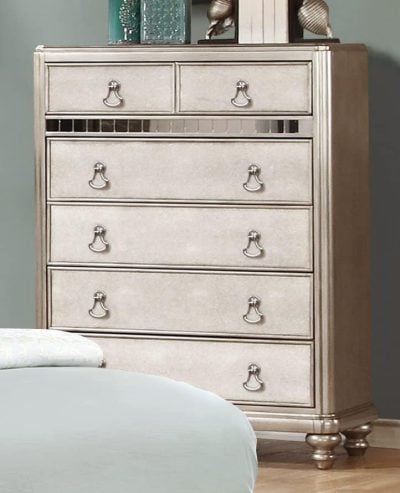 The Platinum mirrored trim chest features a mirror insert and platinum upholstery with polished silver finish.
