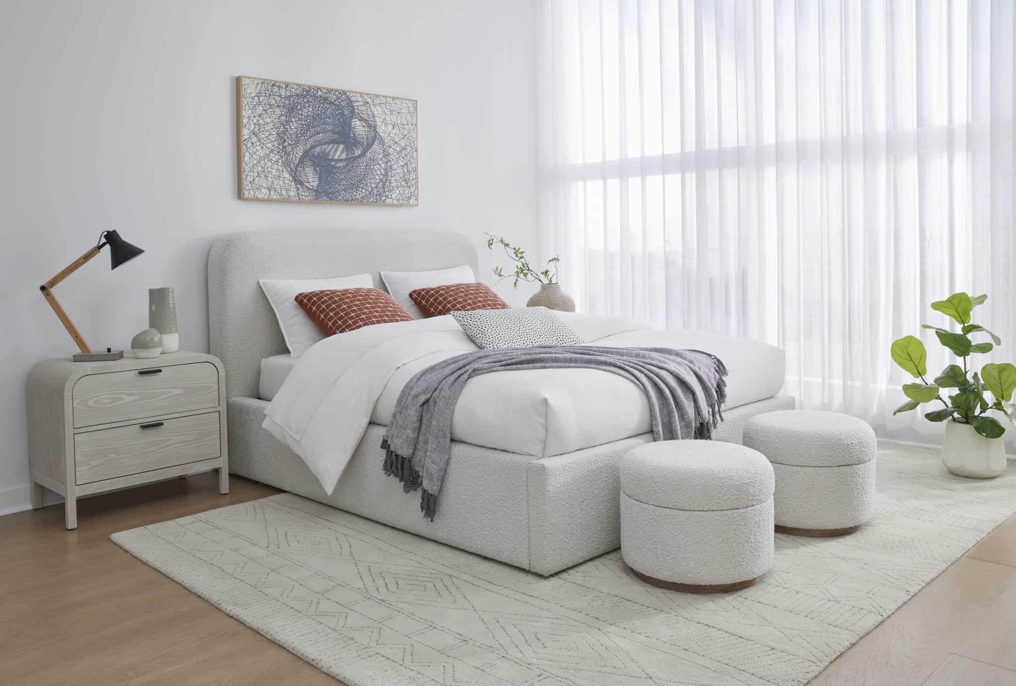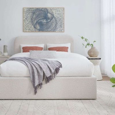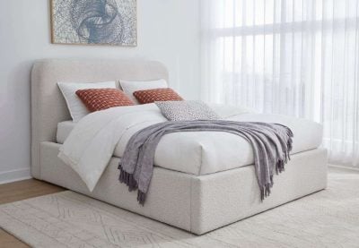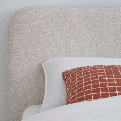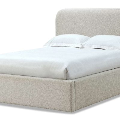 Presenting the Off-White boucle bed – Adorned in off white boucle upholstery, it showcases a blend of off-white and warm beige. Designed for the modern minimalist, its gracefully curved structure embodies sophistication. With a supportive sleep surface and easy care fabric, spills and stains are no worry. Rounded headboard corners add a soft touch, while the bold footboard signifies modern boldness. Supported by sturdy legs with non-marking levelers, this bed promises stability. Dive into luxury and elegance with the Off-White boucle bed – a dreamer’s delight.