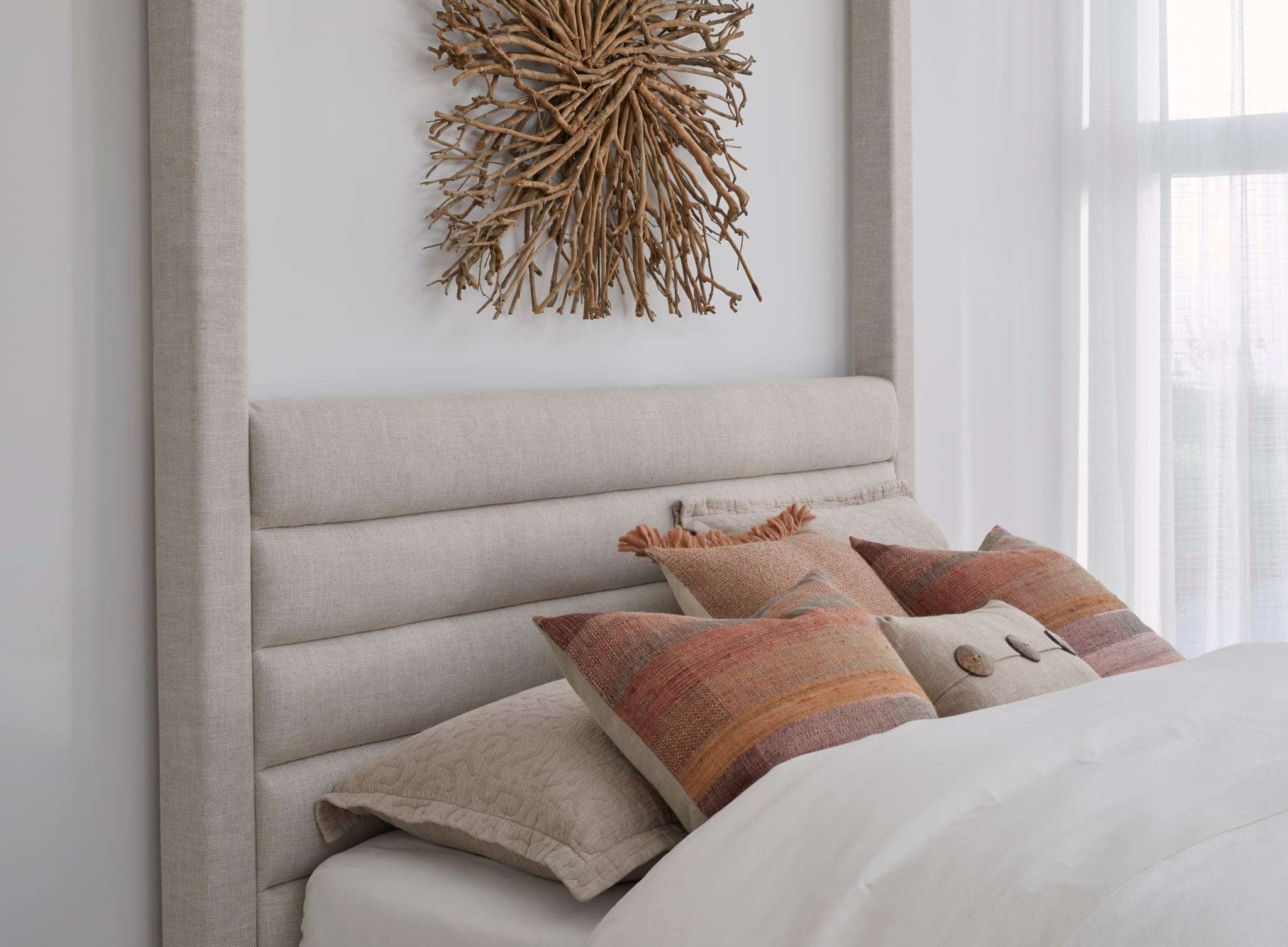 The Rockford bed, upholstered in premium linen, is a blend of classic elegance and modern comfort. Its luxurious Turtle Dove fabric—a subtle mix of off-white and gray—exudes sophistication. Tailored for use without a box spring, it features a sturdy platform with metal center rails and bent plywood cross slats. The unique canopy design, coupled with hand-channeled headboard upholstery, enhances its regal stature. Rounded rectangle posts and non-marking nylon levelers ensure both aesthetic charm and stability. Choose Rockford for a transformative bedroom experience.