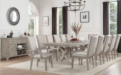 The Rocky Dining Set Collection features a gray oak finish dining table with trestle base and its matching chair. This creates a rustic look to your dining room. Matching Server with wine rack also available to compete the look.