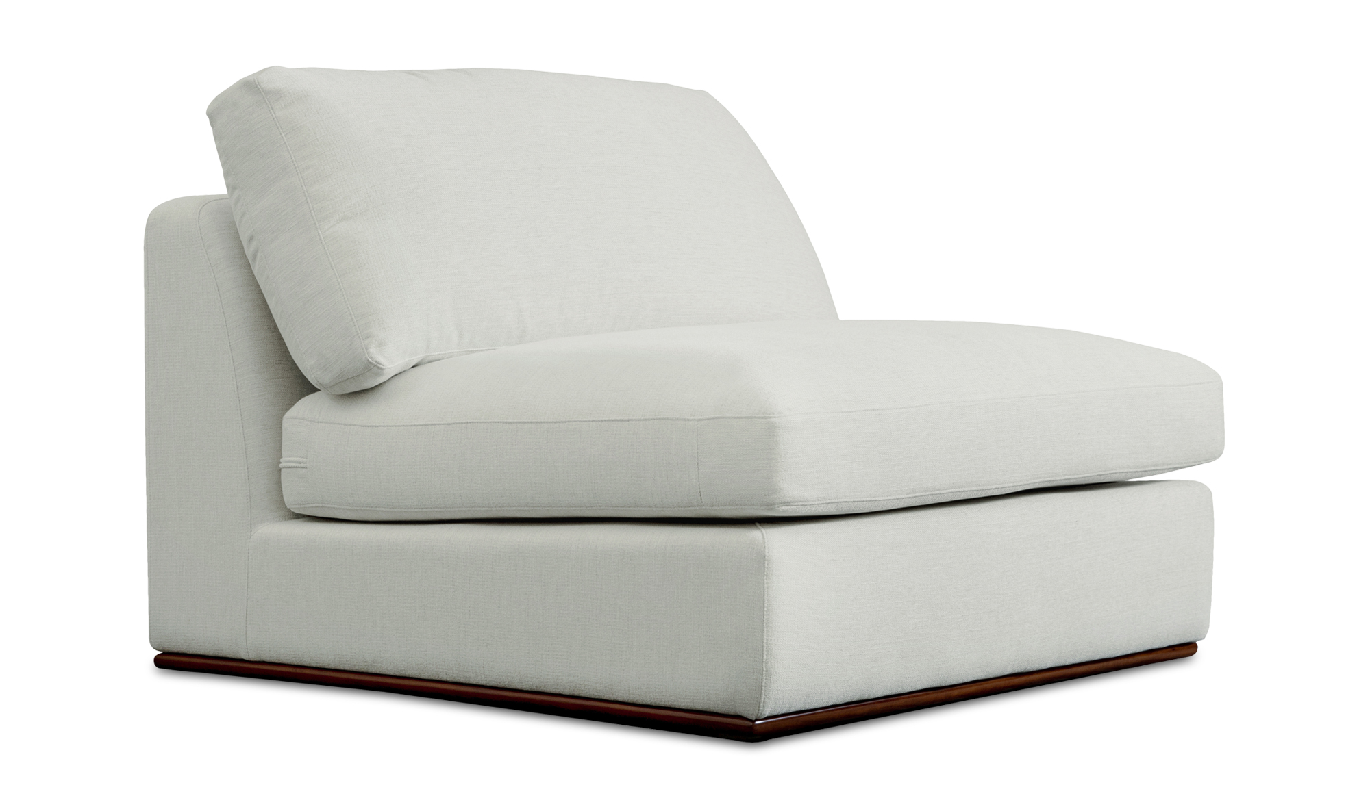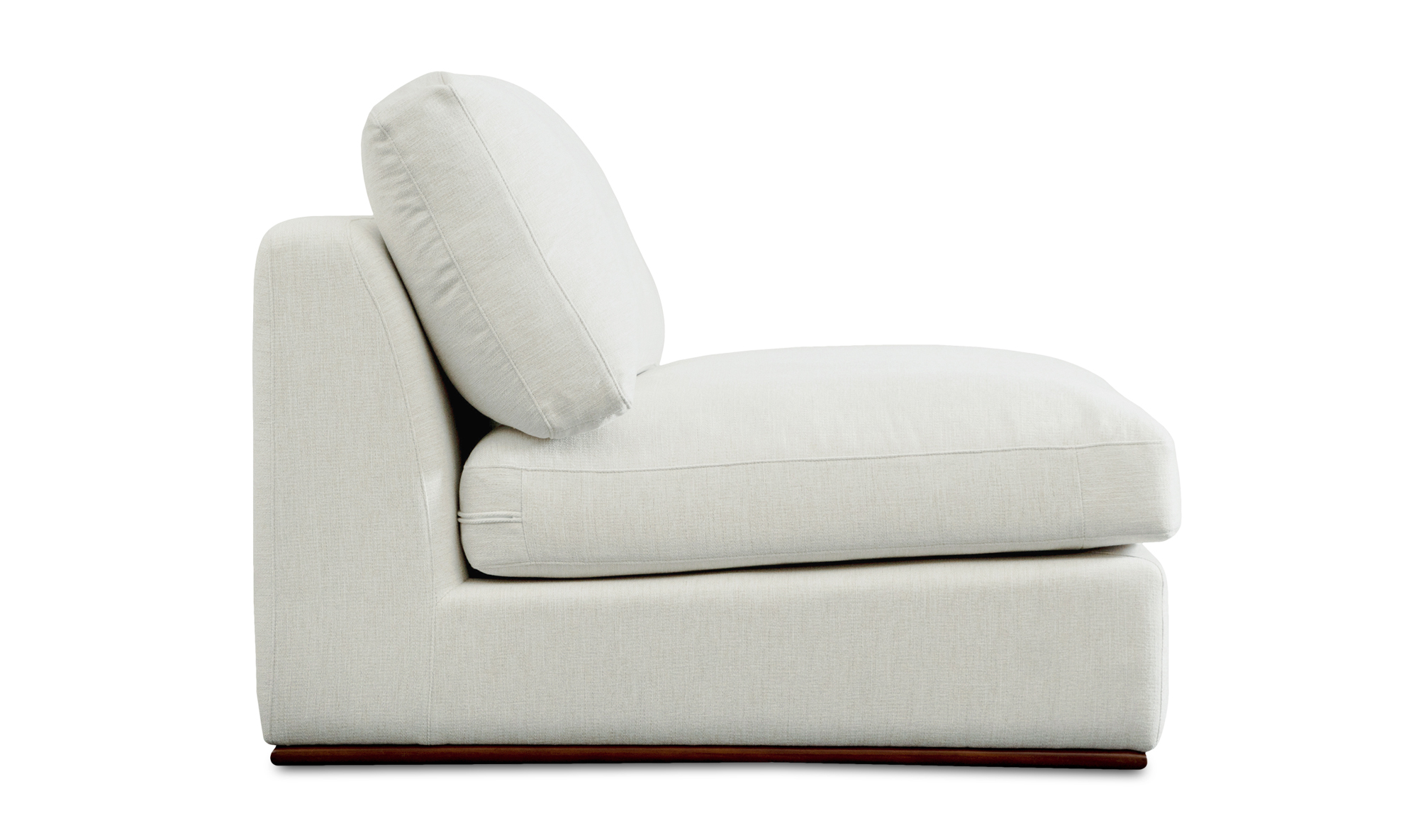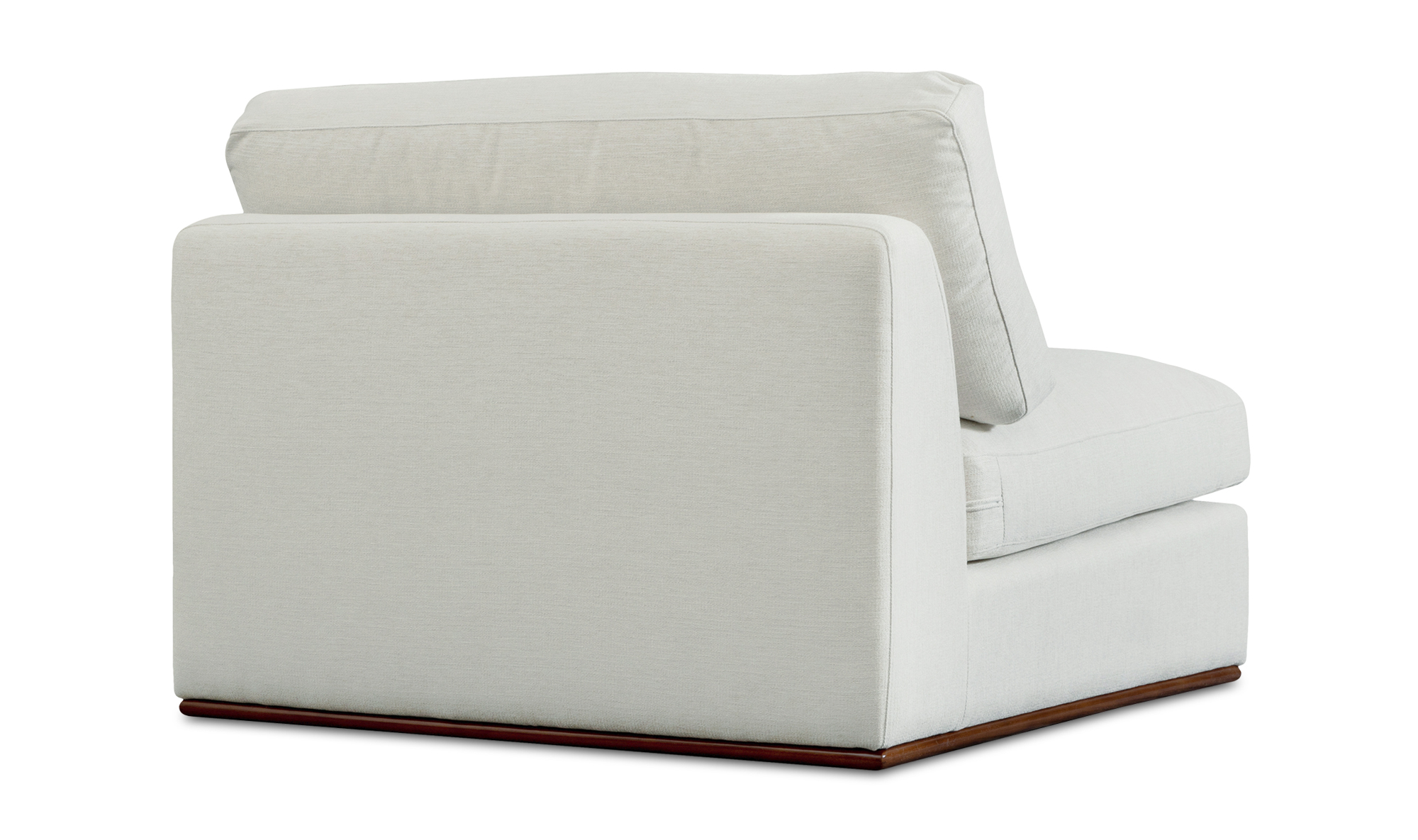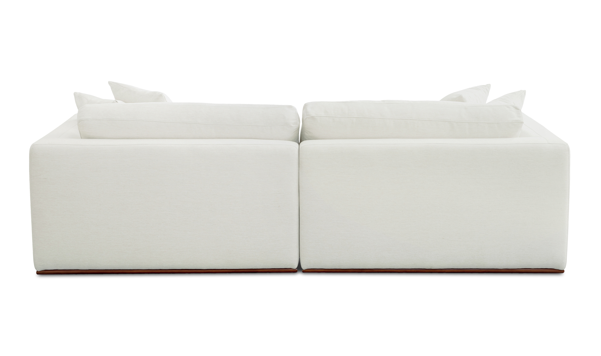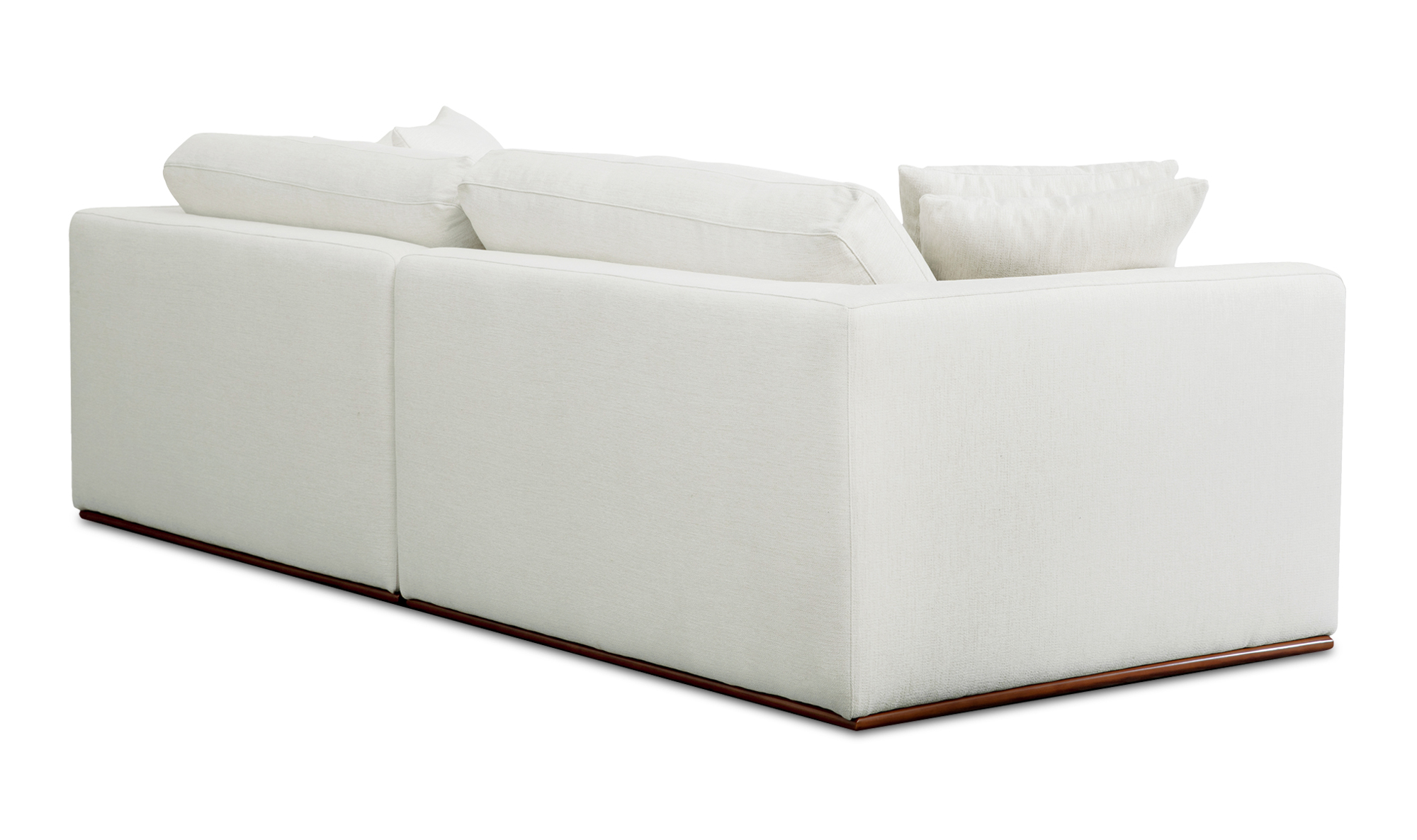 The Rue modular sectional features a generous 70% feather-fill topper within its seating, accompanied by toss cushions for an added layer of coziness. Its elegant silhouette is highlighted by a rubber wood base, creating a sleek floating appearance, all supported by subtle wooden legs. Designed with extreme comfort in mind, this modular embodies easy, neutral styling.