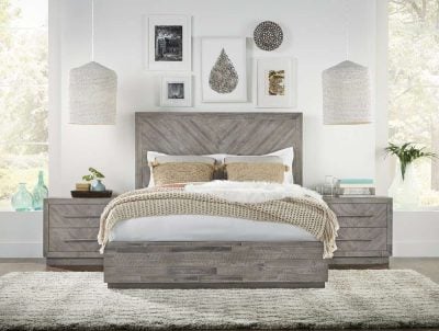 The Rustic Herringbone Acacia Wood Bed, part of the Alexandra collection, uniquely combines a herringbone bed frame with the natural allure of an acacia wood bed frame. This rustic wood bed, designed for use without a box spring, offers a stylish and practical choice for those seeking to blend rustic charm with contemporary design in their bedroom.