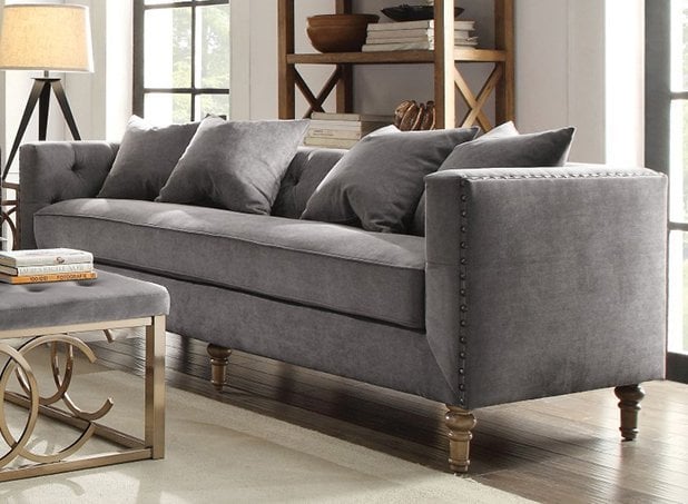 The Sidonia Living Room Collection features a mid-century style with modern details. The set features tufted back cushion, bench style seating high square arm, nailhead trim and wooden turned leg.