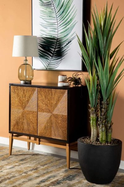 A breathtaking accent table will add life into your entryway or living space. The unique sunburst design on the two cabinet doors makes for a stunning effect. Its two tone design adds to its stylish appeal. This piece is supported on angled and tapered legs. Cabinet doors remain shut with a magnetic closure.