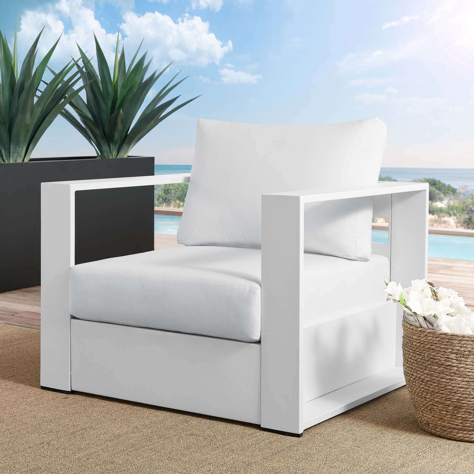 Elevate your Outdoor living space with the Tahoe White Modern Outdoor Sofa, a contemporary and durable outdoor sofa crafted with powder-coated aluminum. Perfect for poolside lounging, this white patio sofa features sunproof and water-resistant fabric-covered cushions with dense foam padding for sustained comfort. The removable, stain-resistant cushions make this modern outdoor sofa low maintenance and high performing. Designed with non-marking foot glides to protect your outdoor flooring, the Tahoe Aluminum Outdoor Patio Sofa is a weatherproof and accommodating choice for al fresco daydreaming. Transform your outdoor living space into a contemporary haven with this stylish and durable white patio sofa. Don’t miss out on the opportunity to bring the Tahoe White Modern Outdoor Sofa to your home. Take advantage of our incredible deals on high-quality outdoor furniture and elevate your outdoor living space at an unbeatable price.
