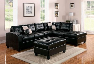 The Kiva contemporary sectional offers contemporary design and amazing style that is sure to please. Features bonded leather upholstery, oversized buttonless tufted seat and back cushions will keep you snug and comfortable. The matching storage ottoman, checkered style accent pillows and wood-like block legs complements the overall look. Available in Black, White and Red finish to choose from.