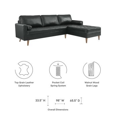 The Valour 98″ Mid Century Modern Black Leather Sectional Sofa adds comfort and elegance to any room. Upholstered in rich top grain black leather, it features biscuit tufting, bolster pillows, and walnut-stained wood legs. Designed with dense foam, pocket coils, and a sinuous spring system, it delivers exceptional support and long-lasting comfort. The tailored silhouette fits perfectly into modern or mid-century spaces. With a spacious 98-inch length and non-marking foot caps, it’s a great choice for families or apartment living. Its timeless style and premium materials make this black leather sectional a refined centerpiece for your home.