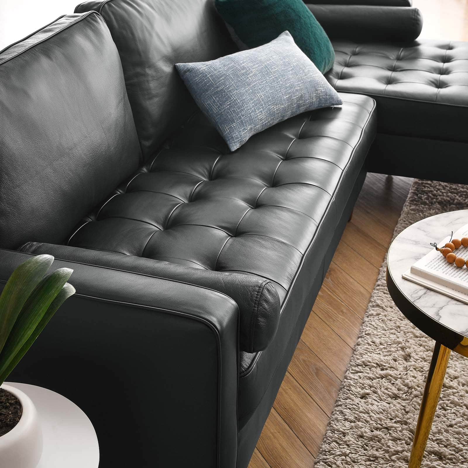 The Valour 98″ Mid Century Modern Black Leather Sectional Sofa adds comfort and elegance to any room. Upholstered in rich top grain black leather, it features biscuit tufting, bolster pillows, and walnut-stained wood legs. Designed with dense foam, pocket coils, and a sinuous spring system, it delivers exceptional support and long-lasting comfort. The tailored silhouette fits perfectly into modern or mid-century spaces. With a spacious 98-inch length and non-marking foot caps, it’s a great choice for families or apartment living. Its timeless style and premium materials make this black leather sectional a refined centerpiece for your home.