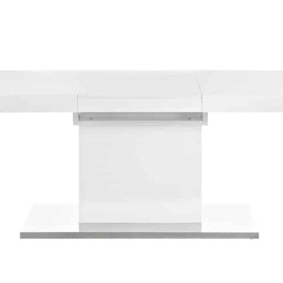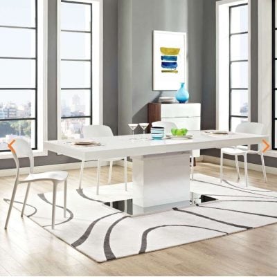 Reimagine your dining decor with the Vector Expandable Dining Table. Tailored for all occasions from intimate dining to festive gatherings, haute cuisine, and home cooking shine equally atop Vector’s high gloss white laminate surface. Featuring durable fiberboard construction, a polished stainless steel base, a butterfly leaf with a lock that collapses inside the distinguished columnal base with ease, and felt pads to help protect your flooring, Vector comfortably seats up to eight people and extends from 71 to 94.5 inches.