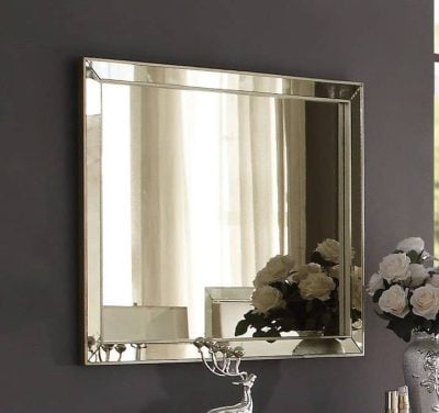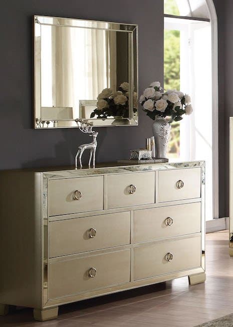 The Voeville III Collection features a modern champagne finish with mirror inlay for an elegant look.