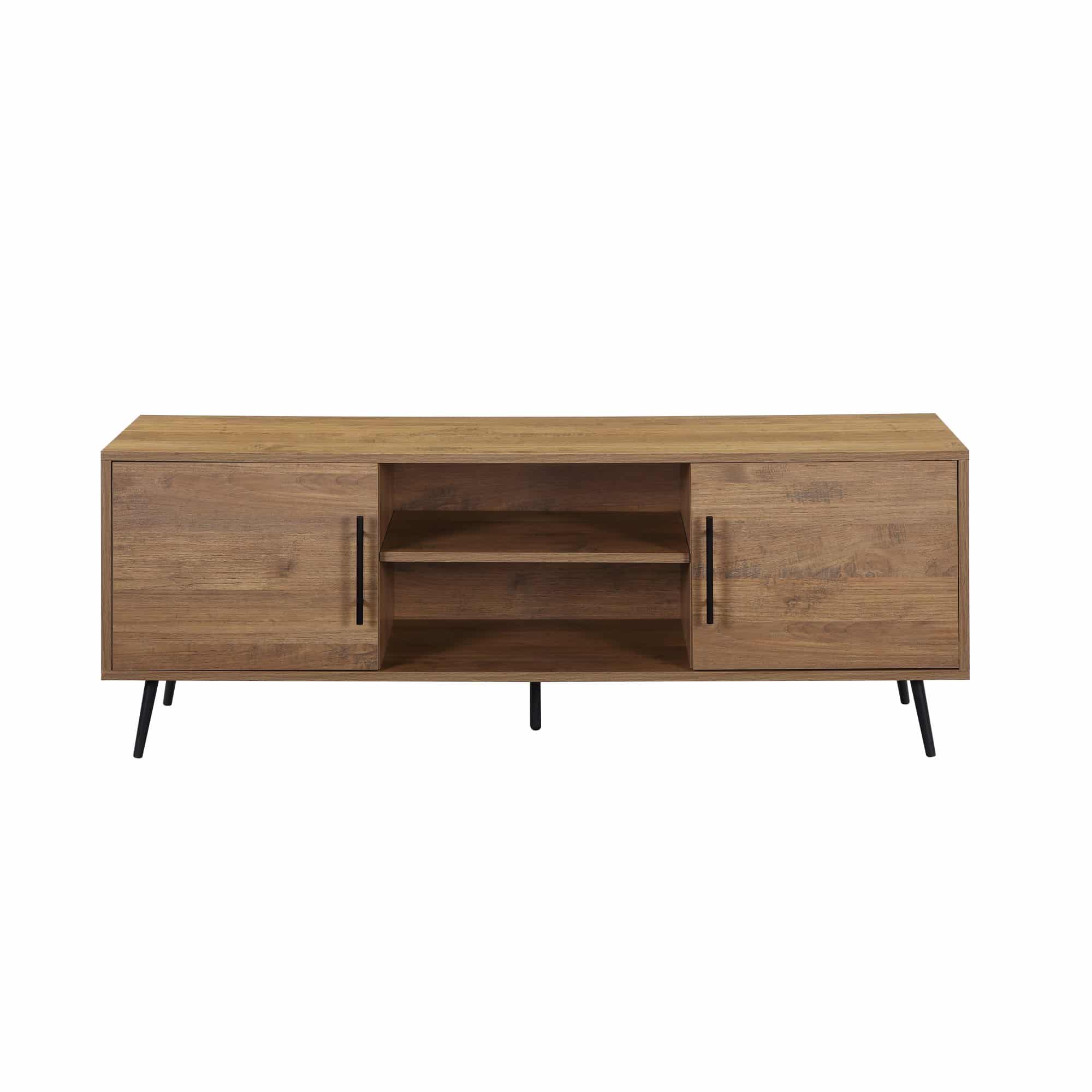 Perfect for any living room, this Wafiya TV Stand will instantly elevates your entertainment area in a sophisticated style. Featuring 2 doors and an open compartment with one shelf, ample storage is provided for your media essentials. Clean-lined design with rustic finish, there is two color options for this piece: rustic wood or rustic oak with white finish. The frame is constructed with manufactured wood while the leg is made of metal; steady and trendy, its rectangular silhouette will fit flawlessly in any space.