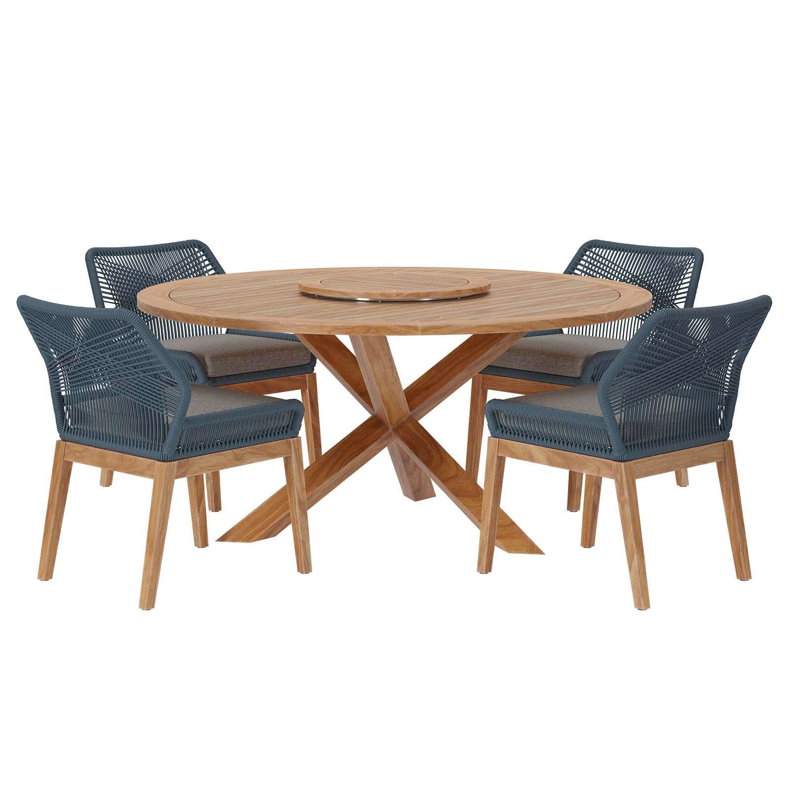 Enhance your outdoor dining experience with the Wellspring Teak & Graphite Blue Outdoor Dining Set. This 5-piece set features a premium solid teak wood round dining table with a removable lazy Susan and four stylish chairs with woven rope details and comfortable blue cushions. Perfect for any outdoor space, this versatile set combines natural beauty with contemporary design. Don’t miss out on our exclusive deals to bring home this elegant and durable teak wood dining set today.