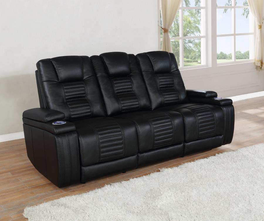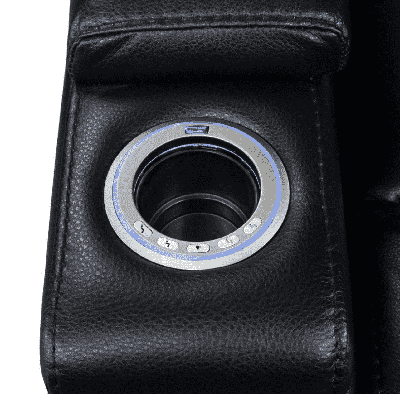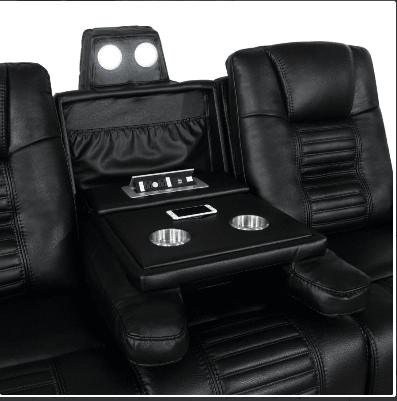 Our Zane black leather reclining sofa set features power reclining seats with power headrests. Wall hugger mechanism optimizes available space. Cup holder control panels with built-in USB port and LED lighting. Drop down table with dual LED reading light, pop-up power outlet (2AC/2USB), wireless charging pad, and two stainless steel cup holders. Convenient storage space in armrests. Full foam cushions offers superior support and comfort. Certi-Pur certified foam.